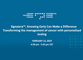 In collaboration with Natera and Lifelabs, Colorectal Cancer Canada (CCC) hosted an Information Webinar for healthcare professionals regarding the Canadian launch of Signatera™, on February 13th 2023.