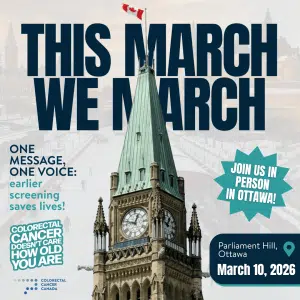 We are calling on our entire community to join us on Parliament Hill on March 10 to deliver a single, undeniable message to our legislators: 50 is too late. We will gather as one voice with one message: earlier screening saves lives. We will create a “Blue Wave” on the Hill—survivors, caregivers, and supporters standing shoulder-to-shoulder to demand the change our community deserves. To ensure this visual is impossible to ignore, we ask that you please come dressed in blue.