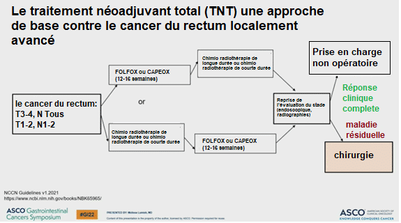 La chimiothérapie néoadjuvante dans le contexte de la TNT consiste habituellement en les régimes de combinaison de FOLFOX (acide folinique, fluorouracile et oxaliplatine) ou de CAPOX (capécitabine et oxaliplatine). Ceci est précédé ou suivi d’une chimio radiothérapie consistant en une radiothérapie de courte ou de longue durée (choix entre la radiothérapie de courte et la radiothérapie de longue durée en fonction du protocole du centre de cancérologie où elle est administrée et des besoins et préférences du patient). Ceci est suivi par une nouvelle détermination du stade du cancer ainsi par la possibilité de procéder à la chirurgie ou non dépendant de la réponse du patient à la thérapie néoadjuvante