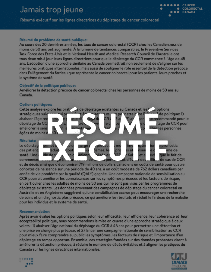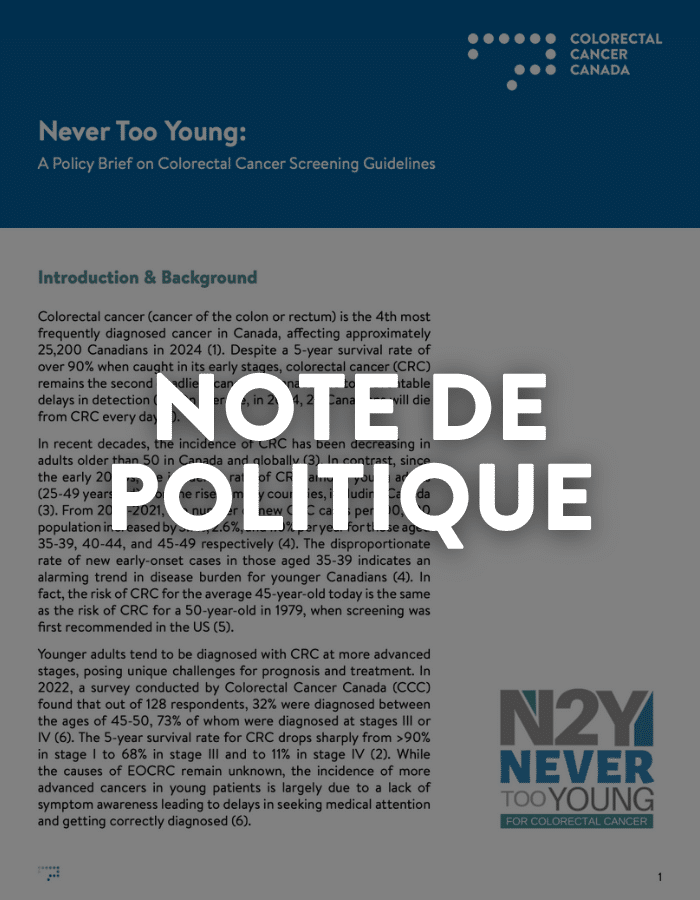 Cancer colorectal Canada (CCC), par le biais de son initiative Jamais trop jeune (JTJ), met en lumière une crise de santé publique croissante : la hausse du cancer colorectal chez les Canadien.ne.s de moins de 50 ans. Bien que les programmes de dépistage actuels débutent à 50 ans pour les personnes à risque moyen, les recherches démontrent que de plus en plus de jeunes adultes reçoivent un diagnostic de cancer colorectal — souvent à un stade avancé, lorsque les chances de survie sont moindres. À ce fait, CCC interpelle les ministères de la santé provinciaux et territoriaux à abaisser l’âge du dépistage du cancer colorectal à 45 ans à l’échelle nationale afin de détecter le cancer plus tôt, sauver des vies et s’aligner sur les meilleures pratiques mondiales.
