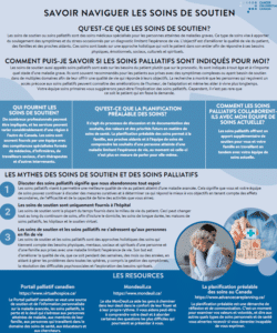 Les soins de soutien ou soins palliatifs sont des soins médicaux spécialisés pour les personnes atteintes de maladies graves. Ce type de soins vise à apporter du soulagement des symptômes et du stress occasionnés par un diagnostic limitant l’espérance de vie. L’objectif est d’améliorer la qualité de vie du patient, des familles et des proches aidants. Ces soins sont basés sur une approche holistique qui voit le patient dans son entier afin de répondre à ses besoins physiques, émotionnels, sociaux, culturels et spirituels.